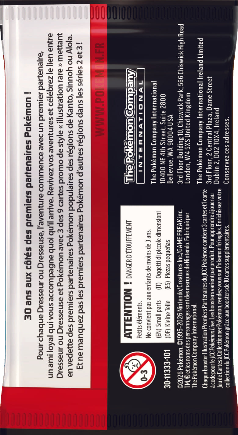 Pour chaque Dresseur ou Dresseuse, l'aventure commence avec un premier partenaire, un ami loyal qui vous accompagne quoi qu'il arrive. Revivez vos aventures et célébrez le lien entre Dresseur ou Dresseuse et Pokémon avec un lot de boosters contenant 3 des 9 cartes promo de style "illustration rare" mettant en vedette des premiers partenaires Pokémon appréciés des régions de Kanto, Sinnoh at Alola. Vous trouverez également deux boosters supplémentaires et une superbe page d'autocollants de premiers partenaires Poékmon.